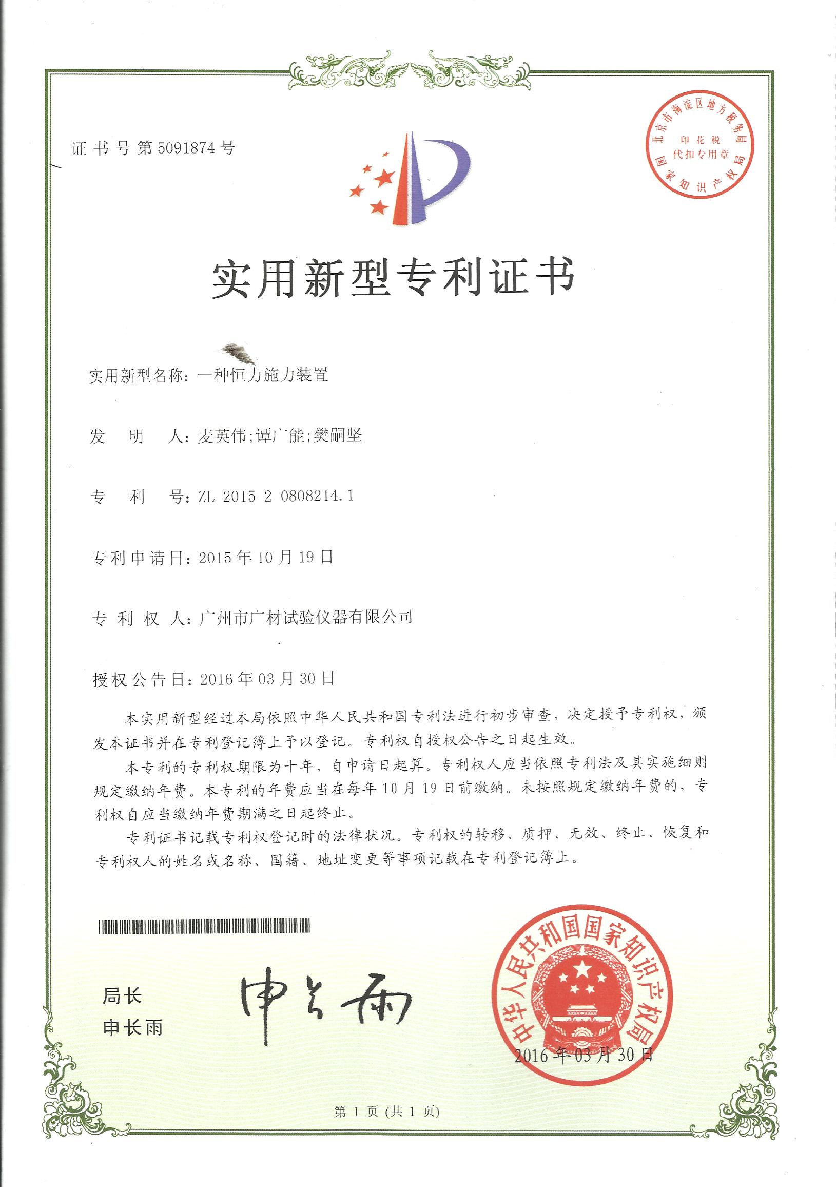 广材试验机资质专利证书