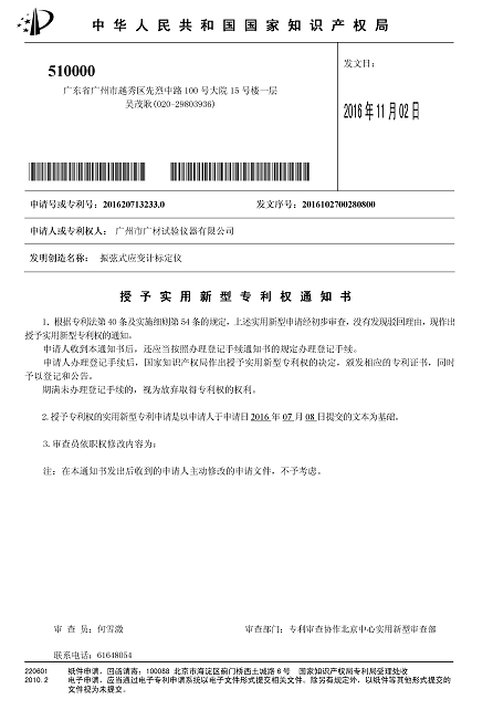 2016年11月02日,中华人民共和国国家知识产权局授予了我司关于振弦式应变计标定仪的实用新型专利权的通知,这意味着广材试验仪器公司继今年已获得的4项实用新型专利,2项软件著作权,又一自主研发的项目获得国家知识产权局承认,这项国家专利坚定了广材公司一直坚持走自主研发,自主设计的道路,为国家物理力学性能检测行业贡献自己应有的力量。在当今本行业厂家已经标准化模式生产试验仪器,广材公司却能够在此基础上根据客户不同的需求,定制出满足客户需求的试验仪器,直接体现了广材公司研发中心强大的自主研发实力。广材公司相信随着社会的不断进步,科技不断创新,定制化服务将会越来越深入人心。